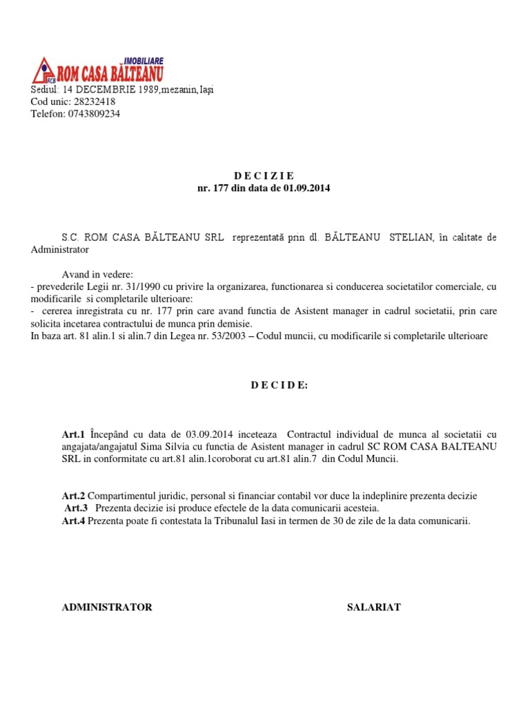 Https Www Bia Ro Uploads Files Decizie 20de 20incetare 20cim 20prin 20demisie Pdf