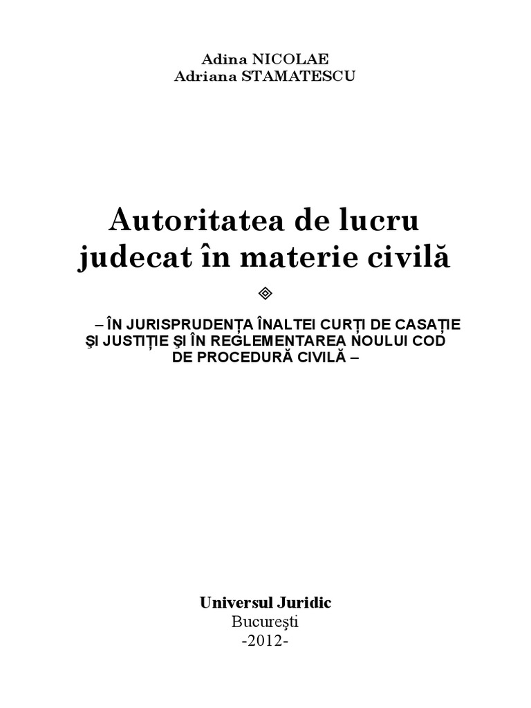 Autoritatea De Lucru Judecat In Statornicirea Noului Cod De Procedură Civilă Revista Dreptul