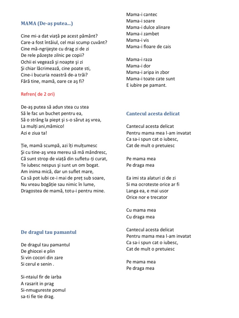 Ea îmi stă alături zi de zi și mă ocrotește orice ar fi lângă ea e mai ușor orice nor e trecător. Versuri cantecul acesta delicat. Cantecul acesta delicat pentru mama mea l am invatat ca sa i spun cat o iubesc cat de. Cântecul cântec pentru mama versuri şi varianta audio cântecul acesta minunat pentru mama mea l am învăţat ca să i spun cât o iubesc cât de mult o îndrăgesc pe mama mea pe draga mea.
