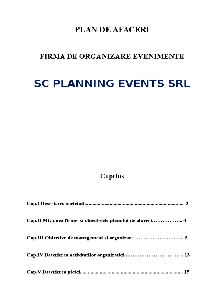 Proiect Plan De Afaceri Firma De Organizare Evenimente Sc Planning Events Srl Management 274640
