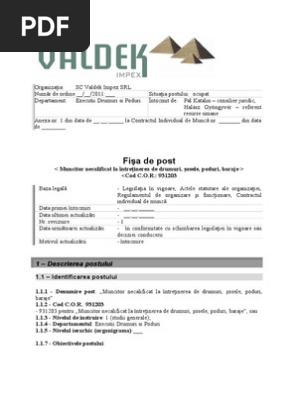 Fișa Postului și Fișă De Evaluare A Performanțelor Individuale Pentru Muncitor Necalificat La Intreţinerea De Drumuri Sosele Poduri Baraje Cod Cor 931203