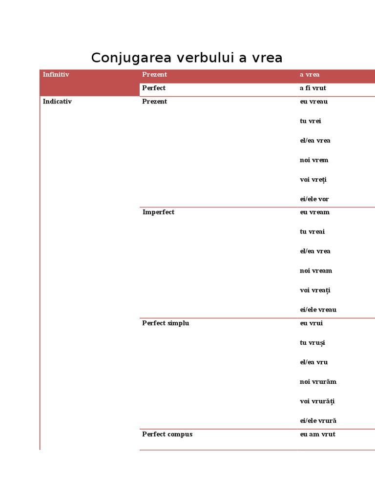Conjugarea Verbului Vrea Indicativ Prezent