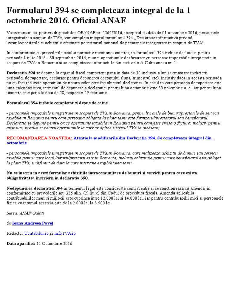 Declaratia 394 Anaf Modificari Completare Integrala Incepand Cu 1 Octombrie 2016