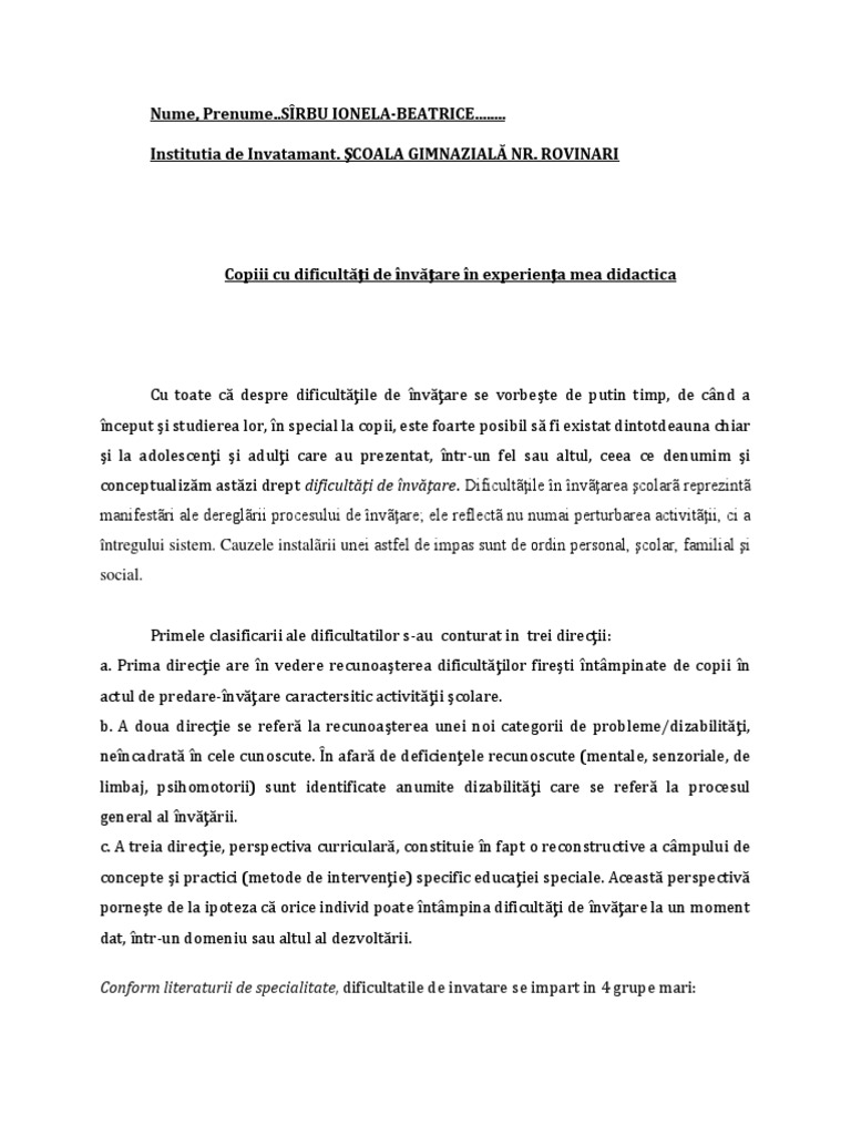 Copiii Cu Dificultăţi De Invăţare In Experienţa Mea Didactica Model Docx