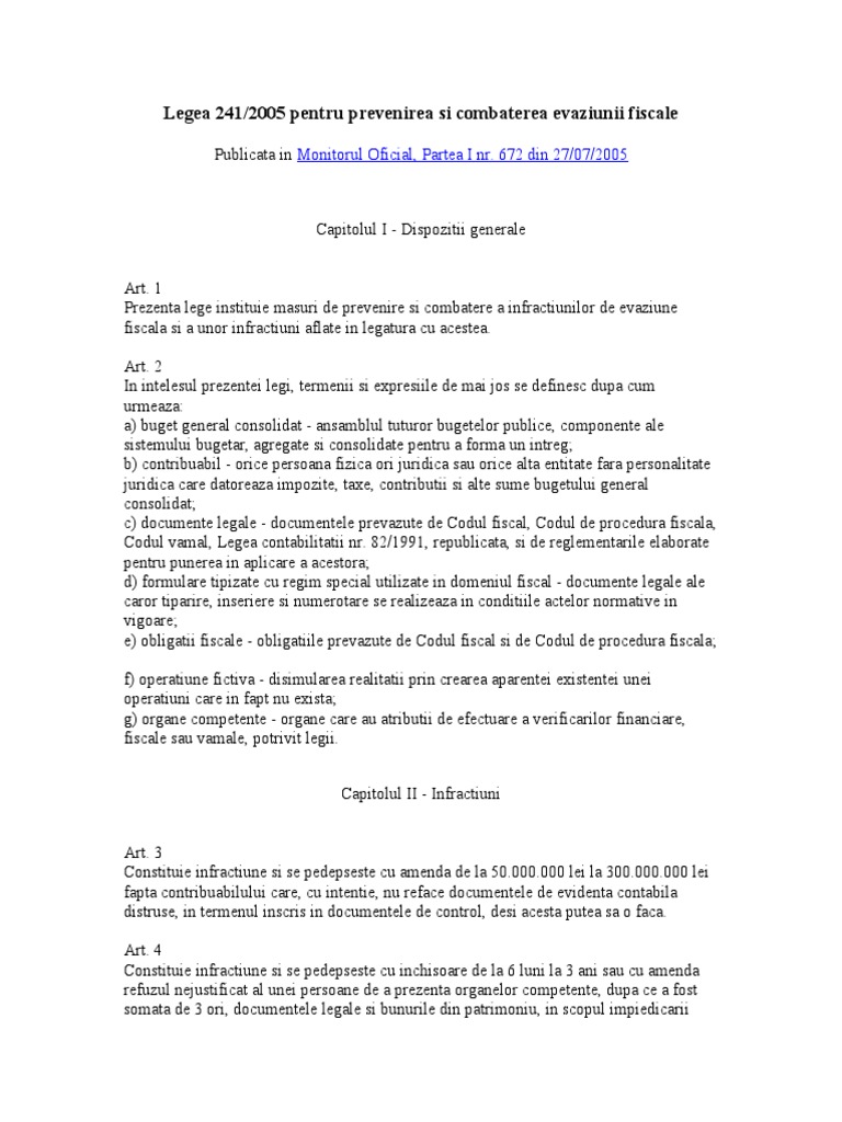 Legea 241 2005 Pentru Prevenirea Si Combaterea Evaziunii Fiscale