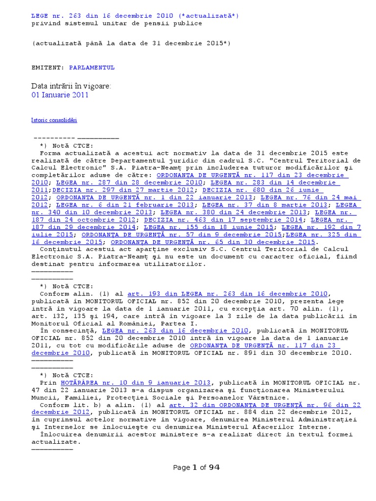 Legea 263 Din 2010 Legea Pensiilor Actualizata Pana La 31 12 2015