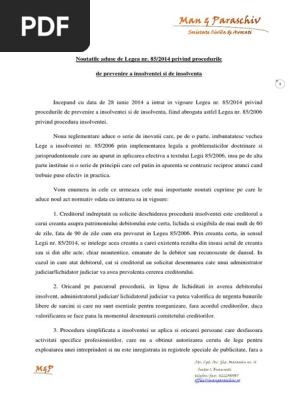 Legea Nr 85 2014 Privind Procedurile De Prevenire A Insolvenţei Si De Insolvenţă Modificări O U G Nr 88 2018 Universul Juridic