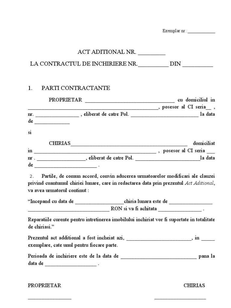 Model act aditional contract. Act aditional la contractul de munca formulare itm 1 formulare formulare itm formulare tipizate formulare licitatii formulare contabile formulare formulare itm formulare tipizate formulare licitatii formulare contabile formulare fisa postului formulare cu regim special formulare bilant formulare cv onrc formulare. Act aditional model un act aditional este un act important pentru orice modificari pe care un contract deja incheiat le va suferi prin intelegerea partilor. 81 2018 privind reglementarea activitatii de telemunca. In functie de particularitatile fiecarei situatii actul aditional poate fi de mai multe forme insa e juridic iti ofera cea mai utilizata forma a acestuia.