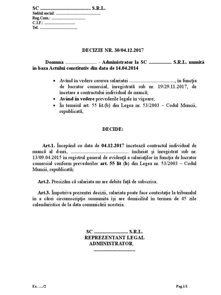 Decizie Incetare Contract De Munca Art 55 Lit B