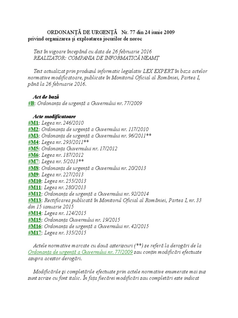 Normele Metodologice De Punere In Aplicare A Ordonanței De Urgență A Guvernului Nr 77 2009 Privind Organizarea și Exploatarea Jocurilor De Noroc Din 24 02 2016 Lege5 Ro