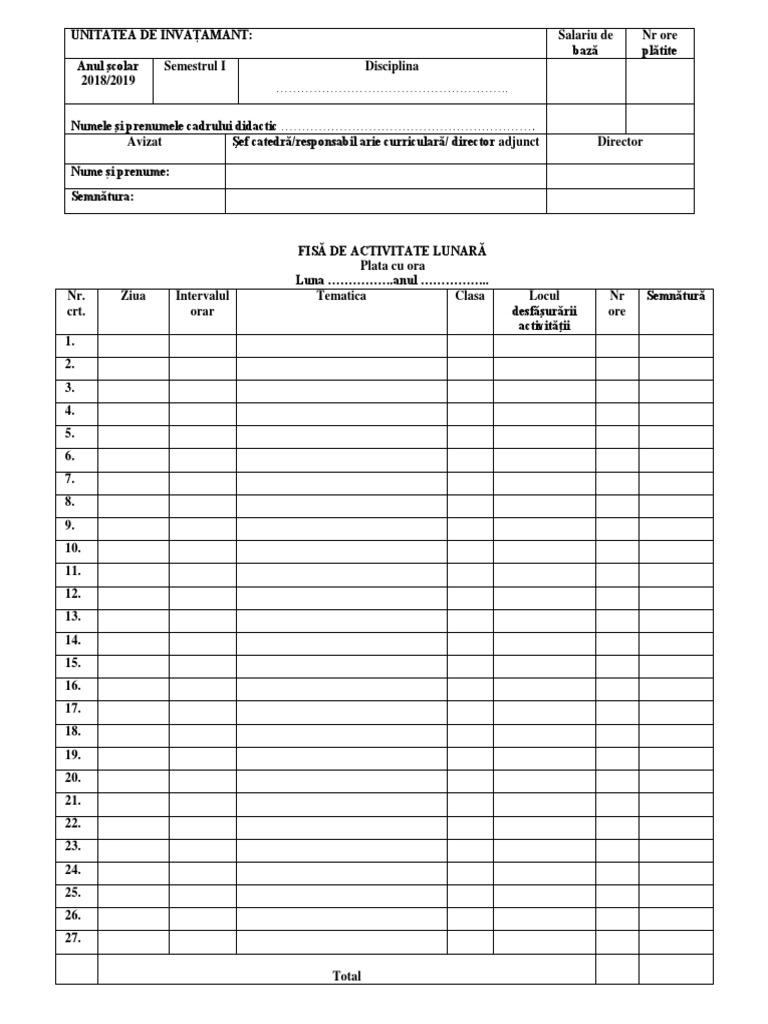 Model Fisa Activitate Lunara Plata Cu Ora