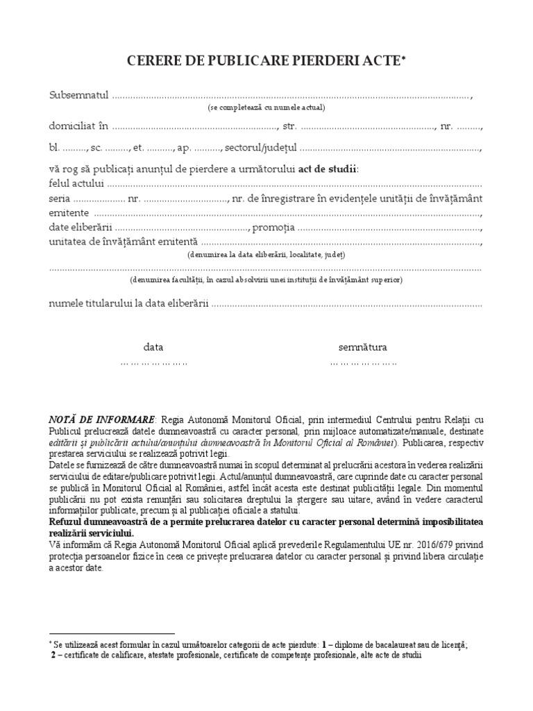 323 Cerere De Publicare Pierdere Acte De Studii Pdf