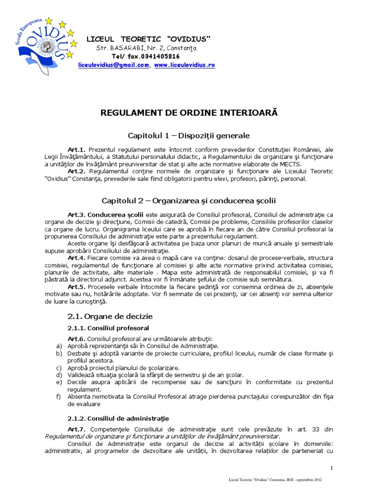 Regulament De Ordine Interioara Liceul Ovidius