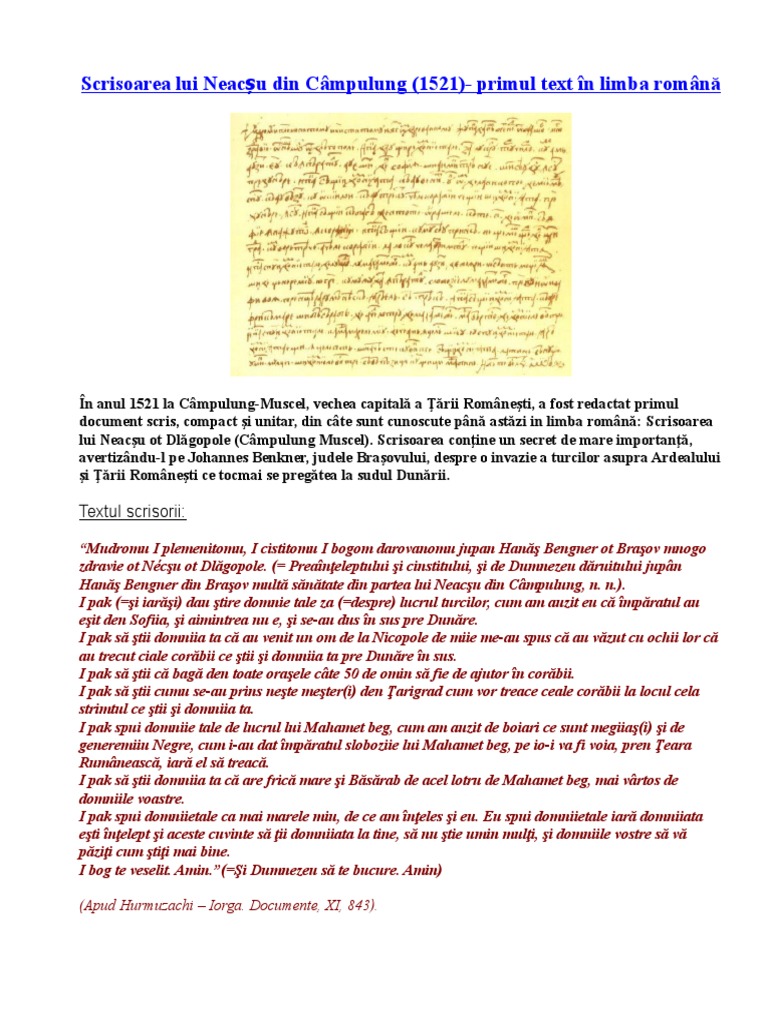 Preaînţeleptului şi cinstitului şi de dumnezeu dăruitului jupân hanăş bengner din braşov multă sănătate din. 29 sau 30 iunie 1521 când sultanul ordona ieșirea armatei din sofia. Scrisoarea lui neacsu din campulung 1521 este cel mai vechi document pastrat scris in limba romana. Scrisoarea lui neacșu din câmpulung 1521 cel mai vechi document păstrat în limba română.
